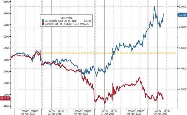 US futures had slumped as much as 3% overnight amid the ongoing collapse of the basis trade, which we first profiled here, only to reverse and turn briefly green just after 3am ET after China released a White Paper on US trade in which it hinted that it was "willing to communicate with the US" but that initial bounce quickly faded after China also warned it would retaliate... and then it did just that after 7am ET, when Beijing announced it would match Trump's latest and raise tariffs on US goods to 84%; this quickly sent futures back near sesion lows and down 2%. Pre-market, Mag 7 names were mixed (Tesla +0.39%, Nvidia +0.22%, Apple +1.1%, Meta +1%, Amazon +1%, Alphabet -0.9%, Microsoft -0.8%), while healthcare stocks were lower as pharma tariffs are earmarked to be released soon. Meanwhile, as we described first late last night, forced sales resulting from the unwind of the basis trade have slammed the Treasury market, where yields surged over the last few sessions and 2Y to 30Y yields are higher again today. At one point the 10Y was as high as 4.50%; this morning JPM asks a question: "If trade imbalances are zeroed out, do foreign countries need to hold Treasuries?" USD is weaker and commodities are mixed with Base Metals/ Energy lower, goal soaring higher, and Ags mixed. Fed Minutes are released this afternoon with CP| tomorrow.In premarket trading, Mag 7 names were mixed (Tesla +0.39%, Nvidia +0.22%, Apple +1.1%, Meta +1%, Amazon +1%, Alphabet -0.9%, Microsoft -0.8%), while drugmaker stocks slide after Trump said the US is planning to announce “a major tariff” on the sector soon: (Pfizer -4.1%, Merck -3.4%, Bristol-Myers Squibb -3.9%, Biogen -2.0%, Eli Lilly & Co -3.3%, Amgen -3.7%, Moderna -2.5%, Johnson & Johnson -3.4%). US-listed Chinese stocks pare gains from earlier in the premarket session or fall as China retaliates with an 84% tariff on US goods (Alibaba +3.1%, Nio +0.32%, Baidu +0.18%, PDD -1.6%, JD.com +2.9%, NetEase +0.40%, Trip.com +2.5%, Li Auto +1.0%, KE Holdings +2.2%, Bilibili +4.2%). Here are some other notable movers: