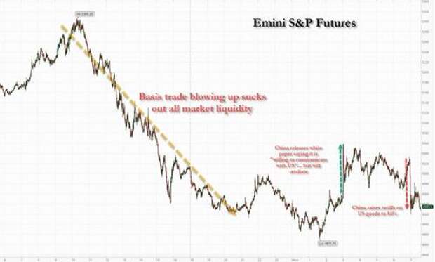 While China's escalation was notable, if expected, the biggest news overnight was the collapse of the basis trade, which we first correctly