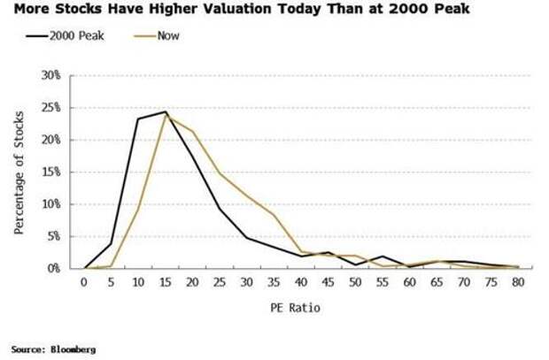 But as always, weighted averages mask what is going on under the surface. If we look at the distribution of P/Es across the index, today’s market is similar to the 2000 peak, except that the current distribution has a fatter right tail, i.e. there are more stocks with P/Es higher than the average.Valuation is about as much use as a helicopter ejector seat when it comes to timing, but as overvalued stocks become more widespread it means when the market does start to sell off it is primed to be more pronounced.