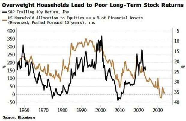 That’s not good for the market outlook. The chart below takes the household allocation to equities above and inverts it and pushes it forward by ten years, and adds the 10-year rolling return for the S&P. As can be seen, high household allocations to stocks is a portent of poor long-term returns. This highlights that even if the bull market persists for a while yet, it is unlikely to be one with especially juicy returns (even more so in real terms).