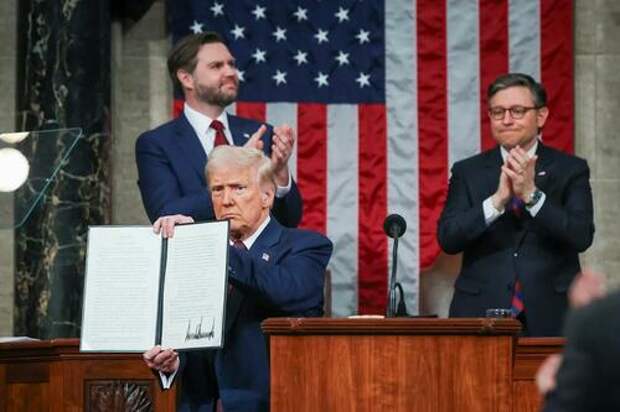 President Donald Trump holds a copy of an executive order honoring Jocelyn Nungaray, a 12-year-old girl who was killed by illegal immigrants, as he addresses a joint session of Congress at the U.S. Capitol on March 4, 2025. Win McNamee/Getty Images