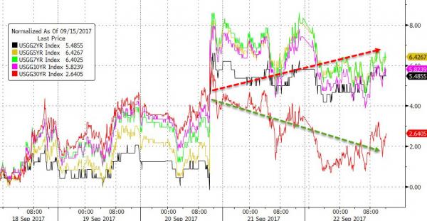 Treasury yields were up across the curve this week but as the folowing chart shows, there was a dramatic flattening at the long end...