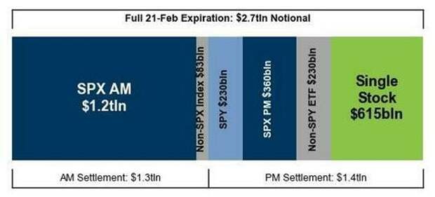 It is a quiet end to a turbulent week but we still have a huge, $2.7 trillion opex to go through. Goldman estimates that over $2.7 Trillion of notional options exposure will expire including $1.2 Trillion of SPX options and $615 Billion notional of single stock options, 9:30 AM Settlement: $1.3 Trillion ($1.2 Trillion is SPX AM), and $1.4 Trillion ($615 Billion single stocks).