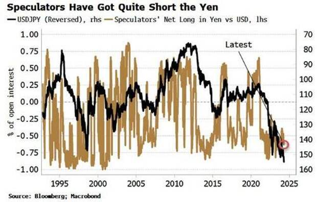 The chart measures the net short versus open interest. Although the short is high, we can see it has been higher, especially in the late 1990s when USD/JPY rose to ~150.