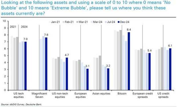 6. DB asked this question 3 times in both 2021 and 2024. Less think there’s a US tech bubble in 2024 than in 2021 but the overall number is still high. There’s been no real increase in the bubble score for the Mag-7 through 2024, even with a 72.5% climb YTD. Bitcoin sees the highest bubble risk and European equities are seen furthest away from this...