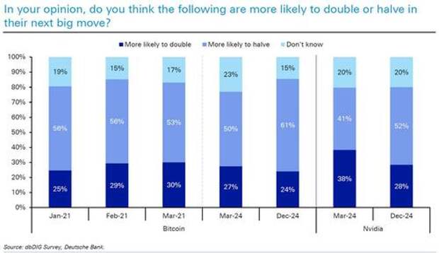 The overwhelming consensus (35%) think between 5% to 10% and much more concentrated than in prior years.11. Bitcoin and Nvidia are seen as more likely to halve than double, especially Bitcoin. However, 24% and 28%, respectively, believe they’ll double. We first asked in 2021, and both have doubled since but did halve into 2022 first
