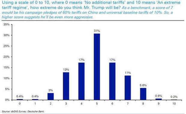 3. Investors think Trump means business on tariffs but an average score of 5 means that they don’t think he’ll be as aggressive as the campaign pledges. Only 6.4% think he’ll be more extreme (8 and above)