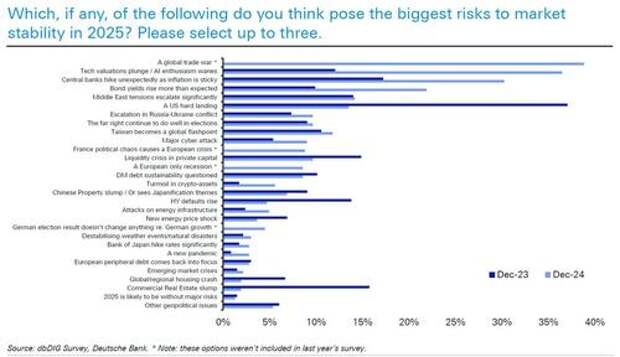 2. A global trade war is seen as the biggest observable risk for 2025, followed by a tech stock plunge and concerns over inflation and bond yields