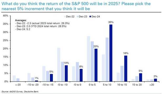 10. The S&P is expected to be +5.2% higher in 2025, with 23% believing it will be lower and 23% believing up >10%.