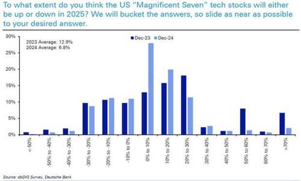 7. For the Mag-7 in 2025 while 33% believe they’ll decline and 22% think by more than 10%, 67% think they’ll be higher with an average overall gain of 6.8% expected, albeit down from the 12.9% expected in 2024