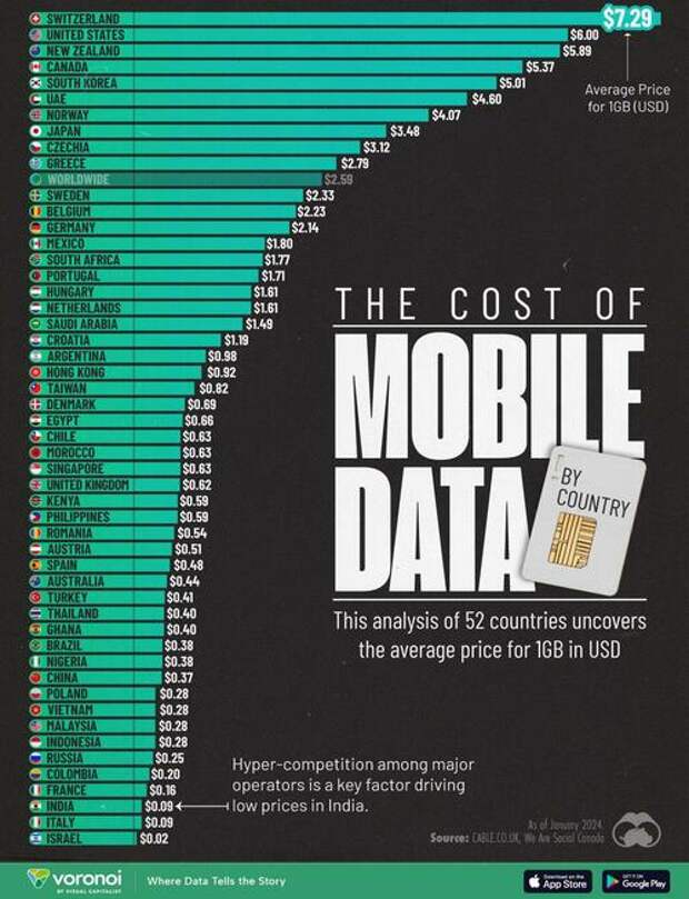 4% of the world’s population.This graphic, via Visual Capitalist's Bruno Venditti, shows the average price of 1 gigabyte (GB) of mobile data (in USD) as of January 2024 across 52 countries.