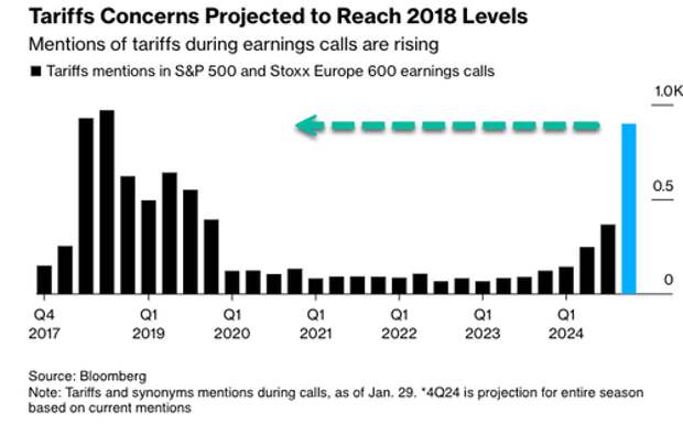 Suppose Trump's tariffs on Canada or Mexico take effect on Saturday. In that case, a sharp increase in tariff and all other trade mentions during future earnings calls between analysts and management teams is expected.