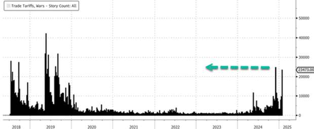 It's no secret that Trump's 'America First' agenda includes imposing across-the-board tariffs on top trading partners. The story count of "tariff" articles in corporate media began surging in mid-2024.
