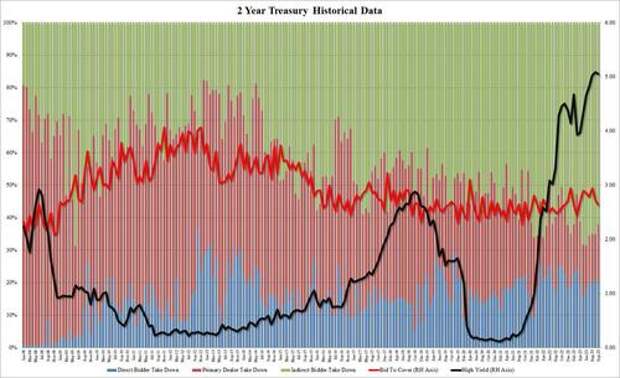 One day after the biggest intraday reversal in Treasury yields following bullish bond commentary by the two "Bills", markets were closely watching today's 2Y auction to see how the sharp drop in yields would impact demand for short-end paper.