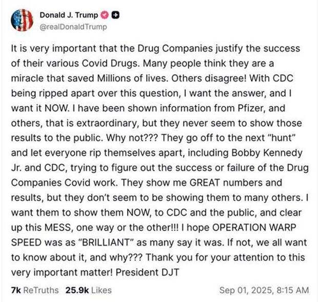 According to Trump, drugmakers need to "clear up this MESS," adding that they "let everyone rip themselves apart, including Bobby Kennedy Jr. and CDC, trying to figure out the success or failure of the Drug Companies Covid work."