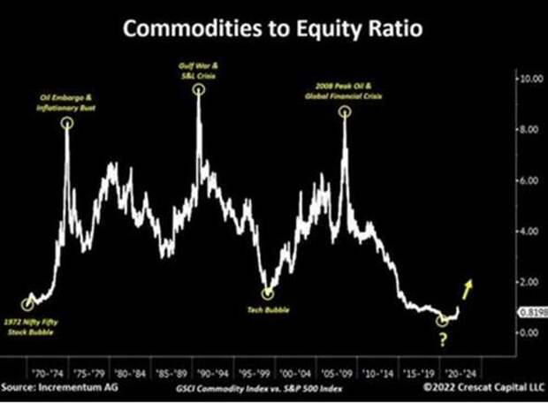 That is, he asked if the world is moving toward a commodity super-cycle wherein real assets begin their slow rise against falling (yet currently inflated) equity markets and a falling (yet increasingly debased) USD.