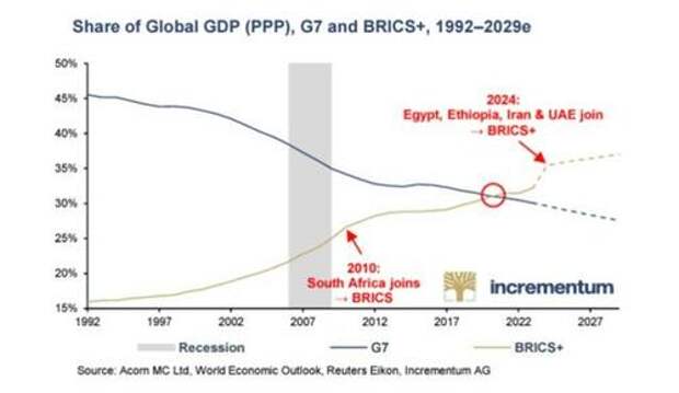 This matters, because like it or not, the rising power of the BRICS+ nations, generationally tired of being the dog wagged by the USD’s inflation-exporting tail, are growing in economic power away from a debt-driven West, which again, the facts (global share of GDP) make clear rather than sensational.