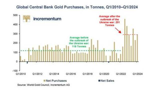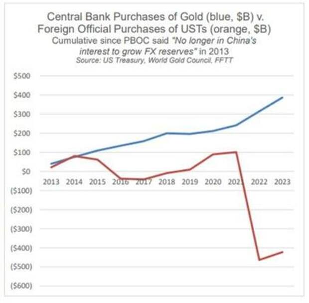That is, since the US weaponized its Dollar, there has been an undeniable move away from the greenback and its UST in favor of gold as a reserve asset: