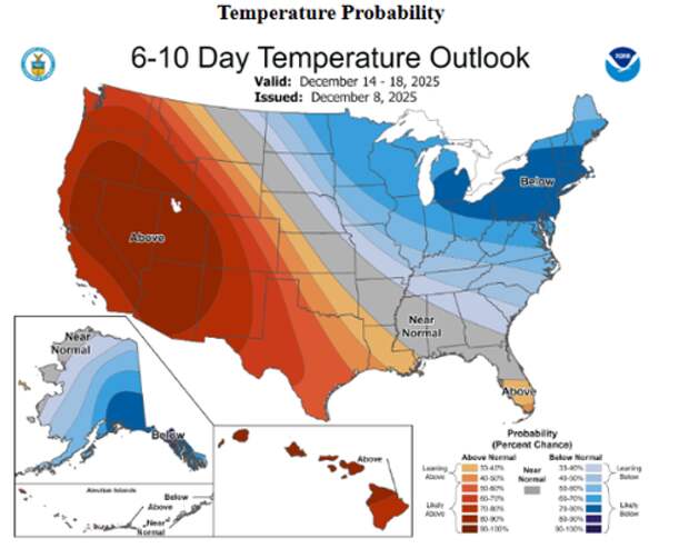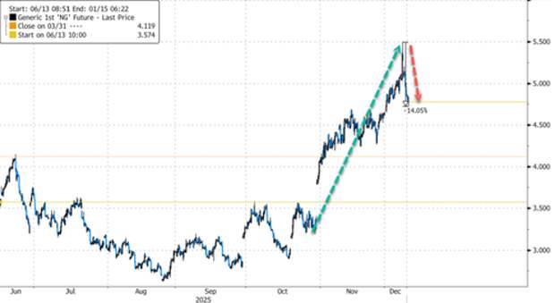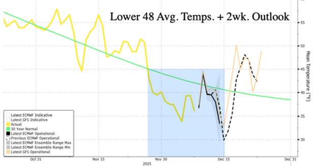 Touching on U.S. NatGas futures, unusually cold weather across parts of the Lower 48 - mostly the eastern half - sent prices sharply higher in recent weeks and months, rising from about $3.50/MMBtu at the end of October to a peak near $5.50 last week. Warmer forecasts heading into Christmas have since driven a roughly 14% pullback.