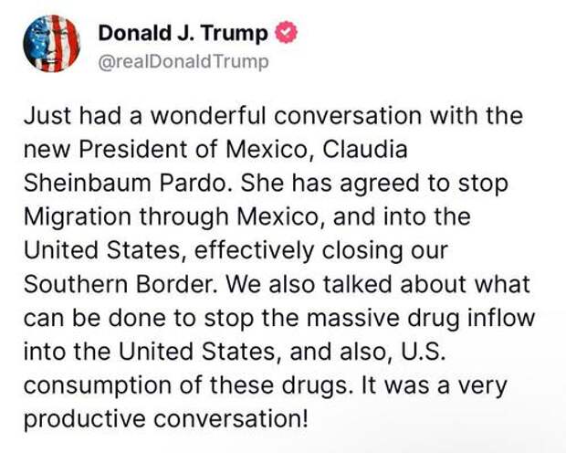 In a post on Truth Social network, Trump announced that after a "wonderful" conversation with Mexican president Claudia Sheinbaum, she "agreed to stop Migration through Mexico, and into the United States, effectively closing our Southern Border."