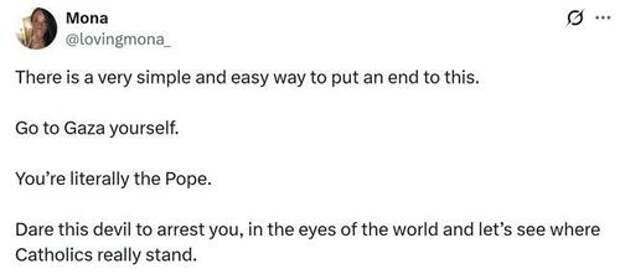 Some pointed to the Pope’s unique status on the global stage, with one writing that “there are like 6 or 7 people that Israel would not have the guts, or free license from the US, to shoot down if delivering aid, and the Pope is one of them”.