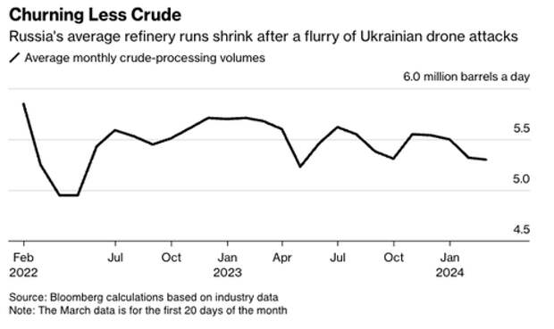 The latest attacks come as new data sourced from Bloomberg shows Russia's average daily oil refining rate was around 5.03 million barrels between March 14 and 20, down more than 400,000 barrels a day from the average for the first 13 days of the month—or a ten-month low.