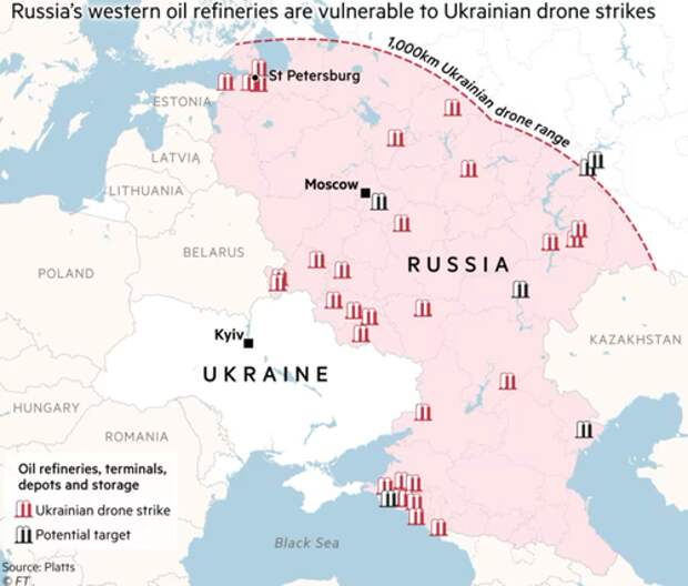 So far, drones have targeted 13 major refineries and two smaller plants, reducing processing capacity by about 480,000 and 900,000 barrels a day.
