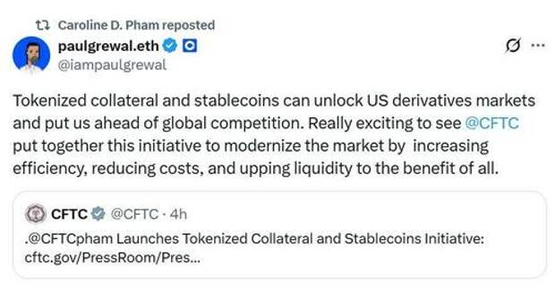 Coinbase chief legal officer Paul Grewal also backed the initiative, and said in a X post on Tuesday that “tokenized collateral and stablecoins can unlock US derivatives markets and put us ahead of global competition.”